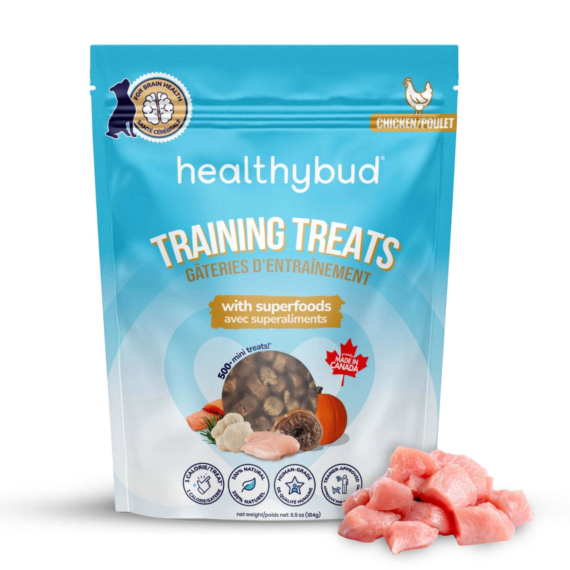Healthybud's Chicken Mini Training Treats are designed for maximum motivation with minimal ingredients. Low-calorie, big flavor, and gentle on sensitive tummies — they're the reward your dog will actually work for.